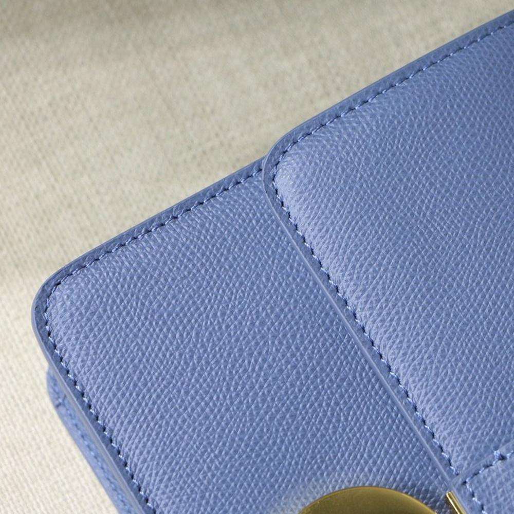 Crafted from luxurious blue-gray box calfskin, the bag is detailed with an antique gold-finish ‘CD’ clasp—a nod to the seal on Christian Dior’s classic perfume bottles. Compact yet structured, it features a front flap, a spacious interior compartment, and a slip pocket at the back for added convenience.