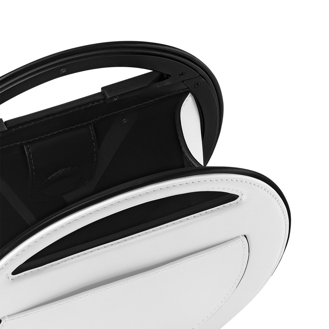 Part of the Spring-Summer 2024 Collection, the Around Me in white and black leather is a compact bag inspired by the House’s LV Circle signature. The design features the LV Initials inside a perfect circle. The rounded top handles are seamlessly integrated, completing the circle. There’s also a removable and adjustable leather shoulder strap.