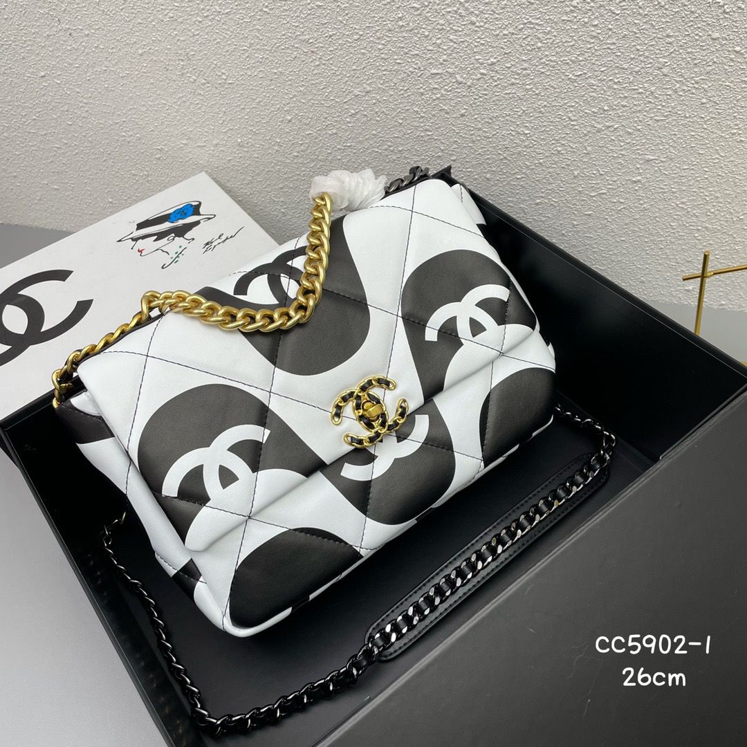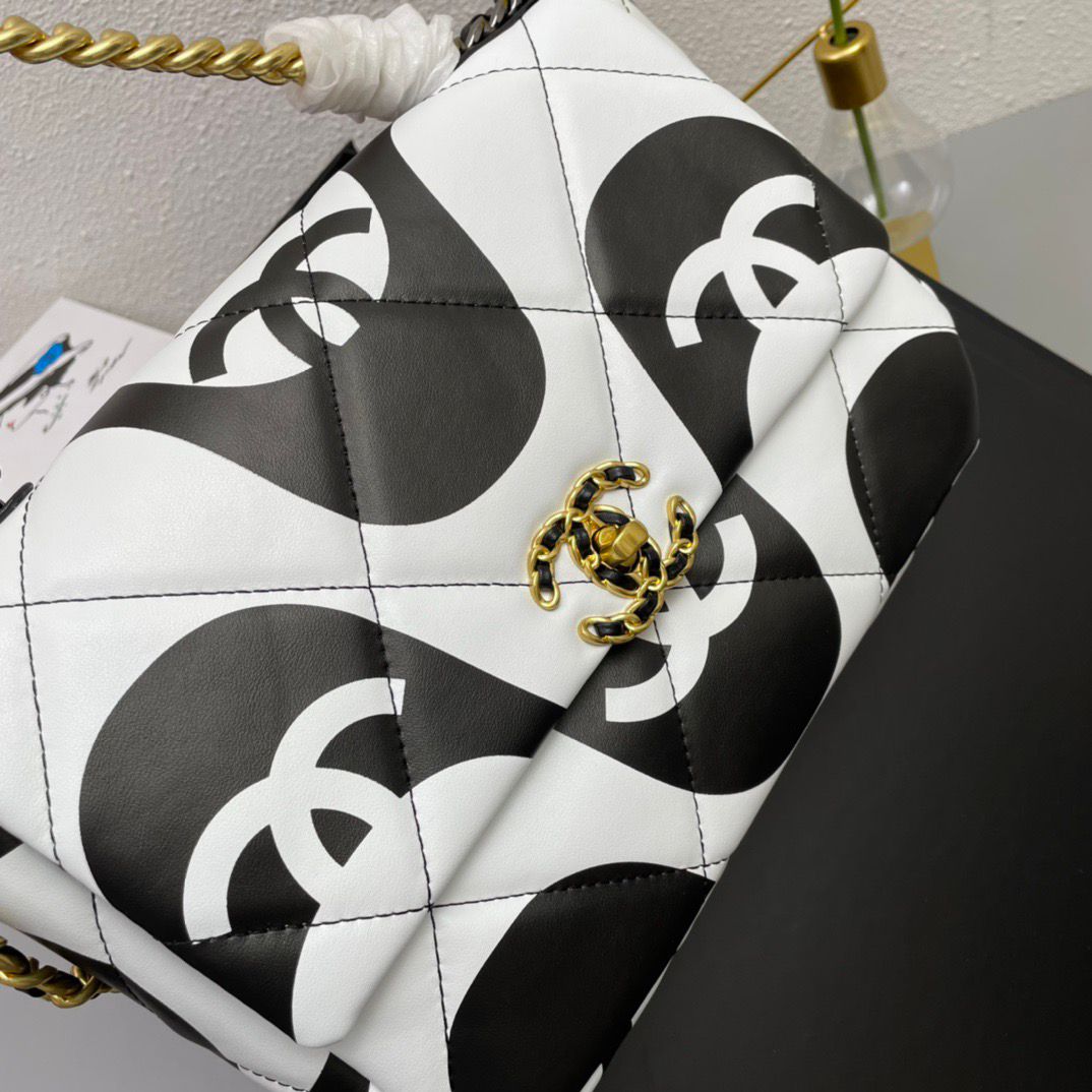 Introducing the Chanel 19 Classic Bag, a perfect blend of modern design and timeless sophistication. Crafted from black and white printed fabric, this medium-sized bag is accented with mixed-tone hardware in gold, silver, and ruthenium finishes, creating a unique and striking look. From the 2021 Spring (21P) season, it exemplifies Chanel’s innovative approach to luxury.