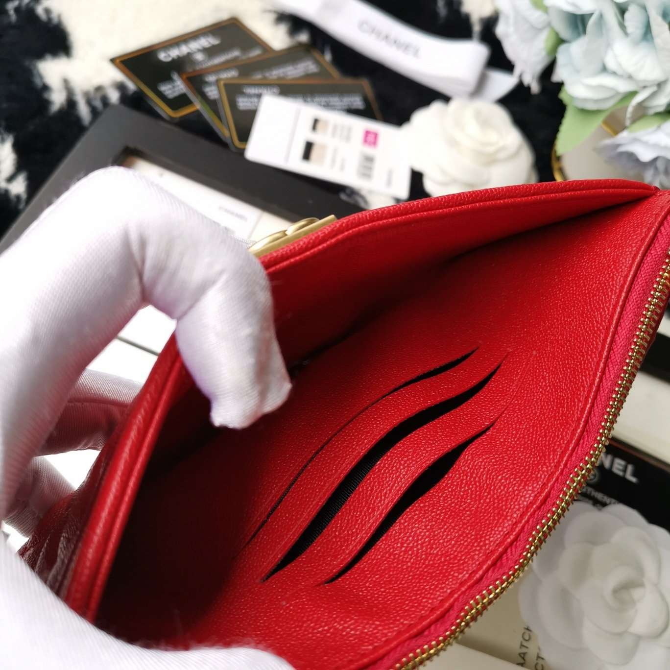 This CHANEL Caviar Quilted Classic Zip Boy Pouch in vibrant red is the perfect blend of chic and practical. Crafted from durable diamond-quilted caviar leather, it features a stylish faux aged gold-tone Boy CC push-lock detail on the top crest. The zipper top opens to a red fabric interior equipped with card slots, making it ideal for organizing essentials with elegance. A fabulous accessory from Chanel that combines timeless design with everyday functionality.