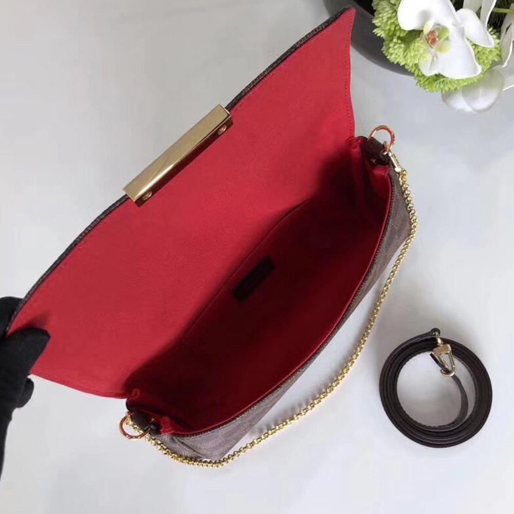 The Favorite MM handbag is indeed the darling of stylish women. Crafted from signature Monogram canvas, it moves easily from day to evening, worn as a short-shoulder bag on its golden chain, carried as a clutch, or styled more casually as a cross-body with its leather strap. The engraved front plate conceals a clever (and secure) magnetic closure.