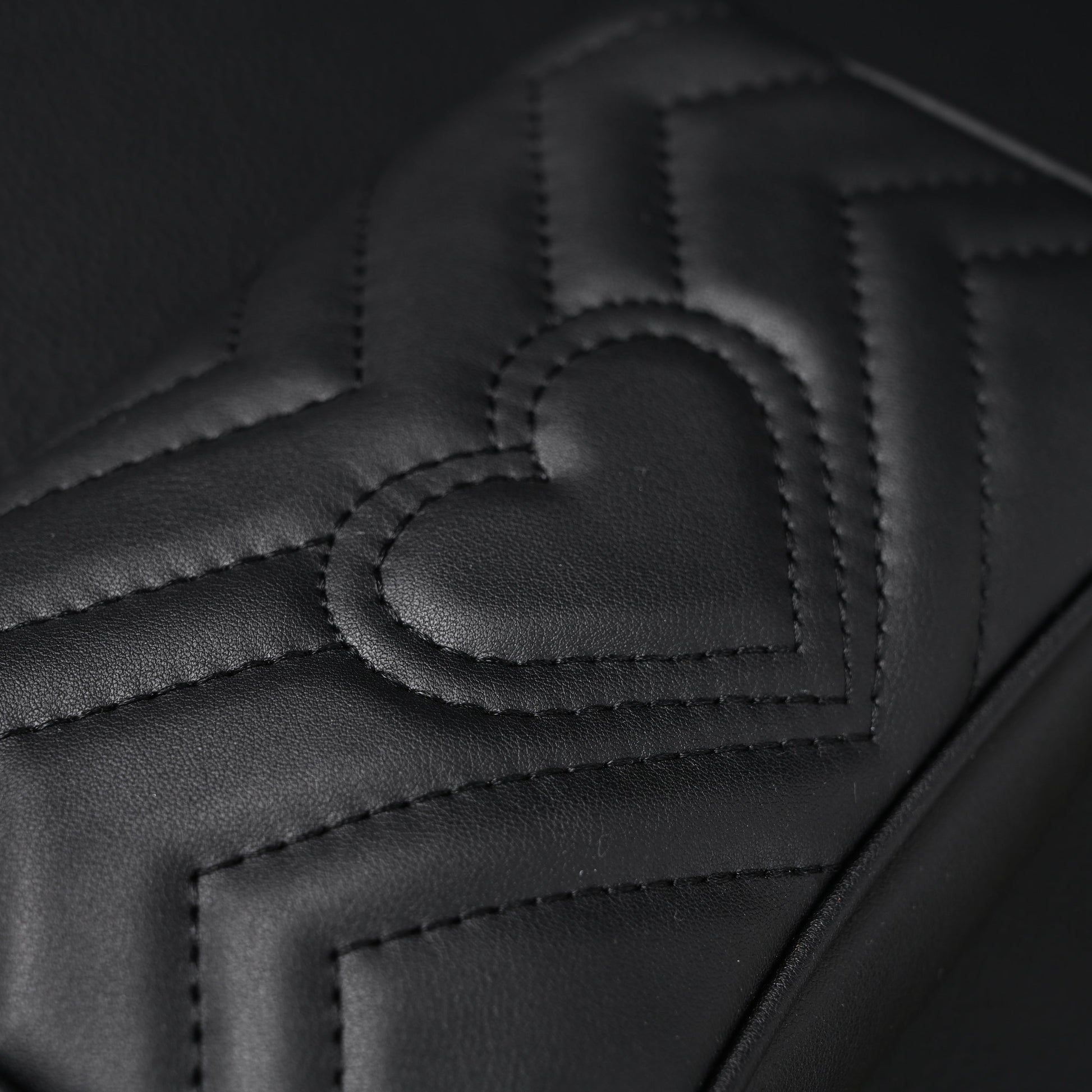 The Gucci GG Marmont Matelassé Mini Shoulder Bag is a timeless icon of modern luxury, designed to elevate any look with its signature elegance. Crafted in soft black matelassé leather, the bag features Gucci’s chevron stitching with a heart detail on the back, embodying both sophistication and charm.