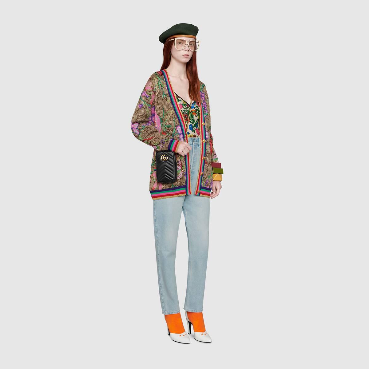 Crafted from black matelassé leather, the mini bag has a vertical design with a zipper closure and interior card slots. Part of the GG Marmont collection, the chain strap bag is defined by the emblematic Double G hardware—a contemporary take on a Gucci archival belt buckle from the '70s that has become a hallmark of the House.