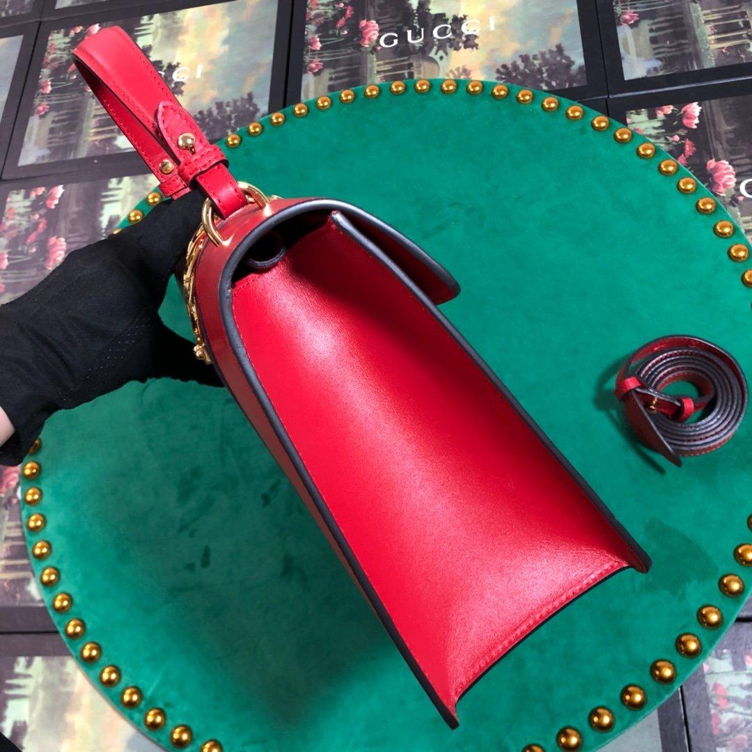 Timeless elegance meets iconic design with the Gucci GG Sylvie Medium Top Handle Bag. Crafted from rich red leather and accented with gleaming gold-tone hardware, this structured silhouette embodies classic Italian sophistication. The signature Sylvie web detailing and flap closure add a refined, instantly recognizable touch.