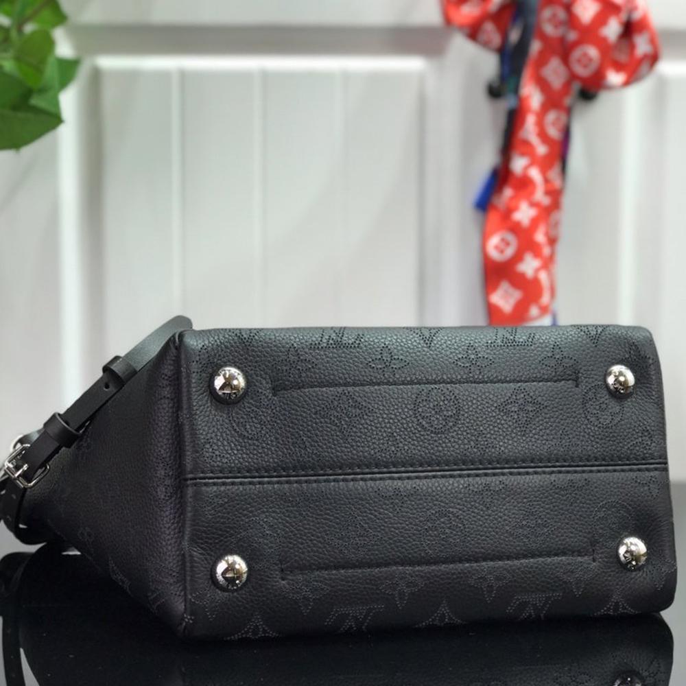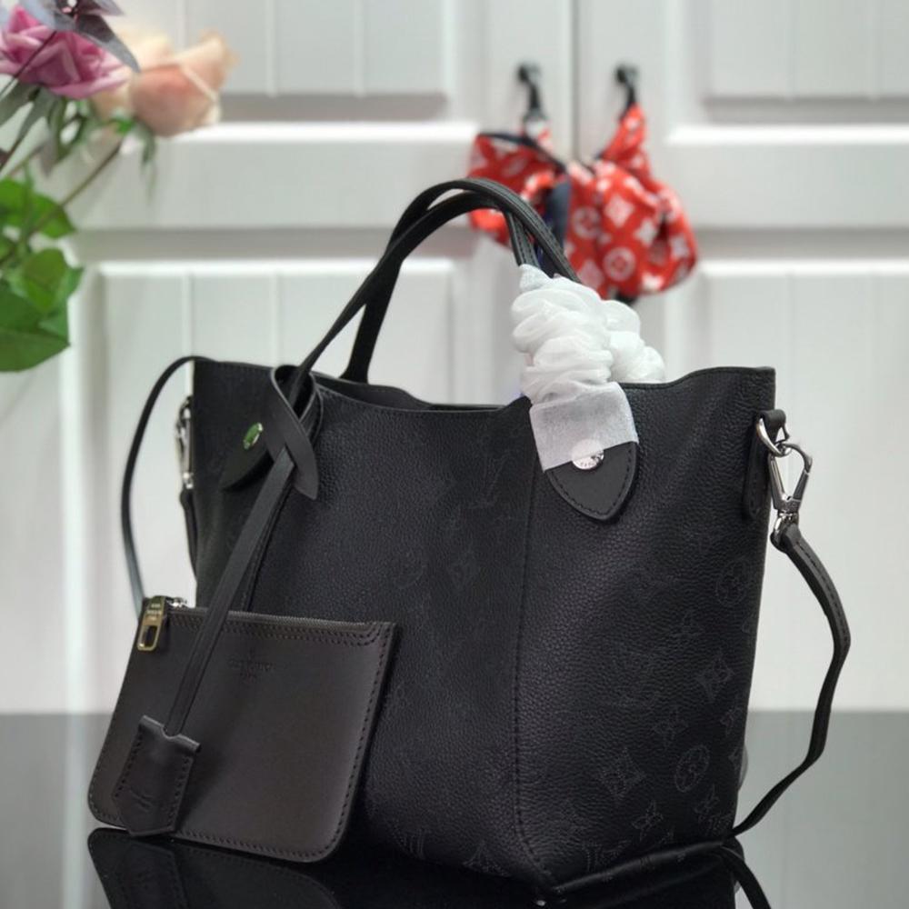 Two bags in one: with its sides gathered in and fastened, the Hina PM is an on-point bucket model; opened wide, it becomes a small casual tote. Made from perforated Mahina calf with calf-leather trim, this model is light and comfortable to carry, either by the two top handles or cross-body on the detachable strap.