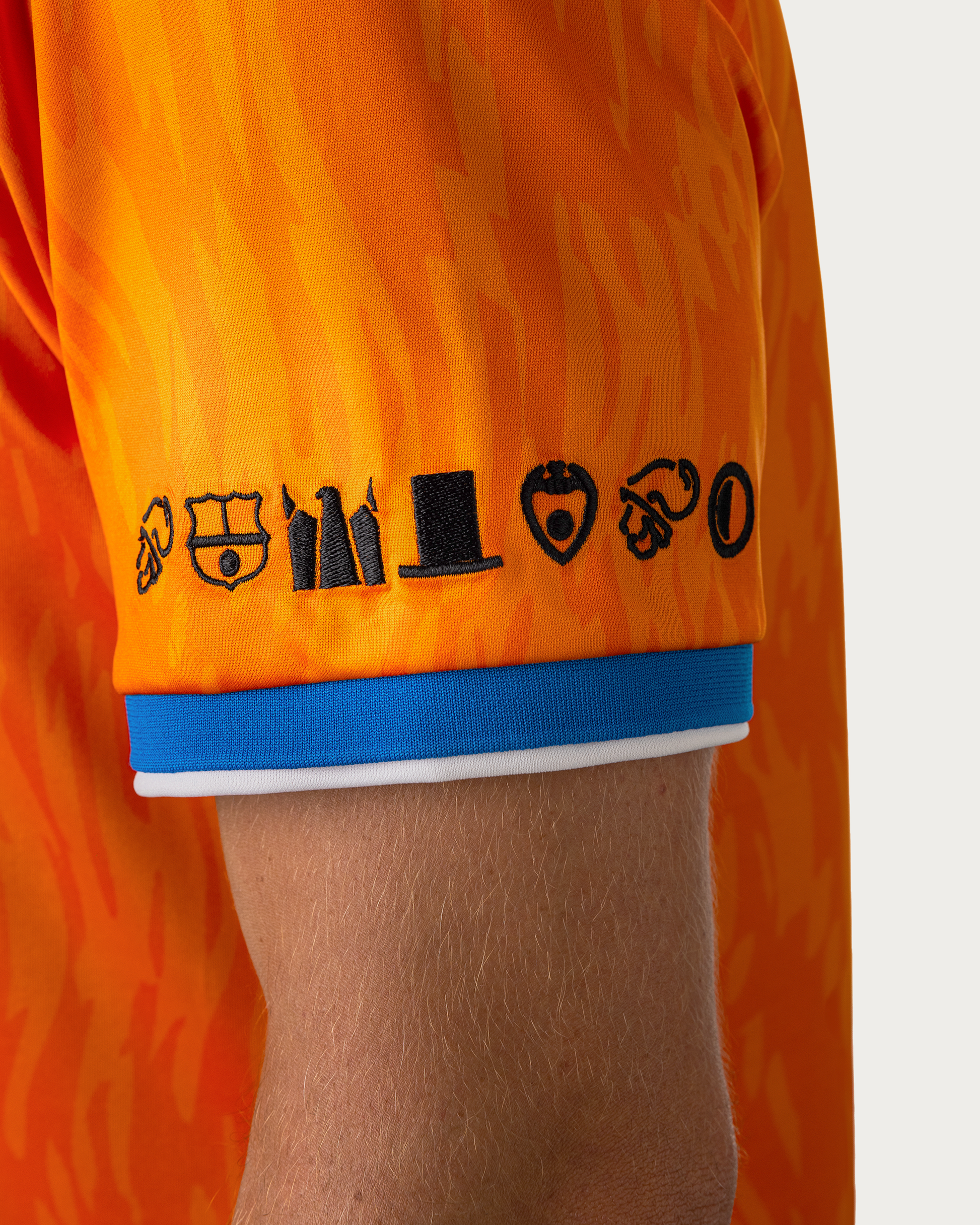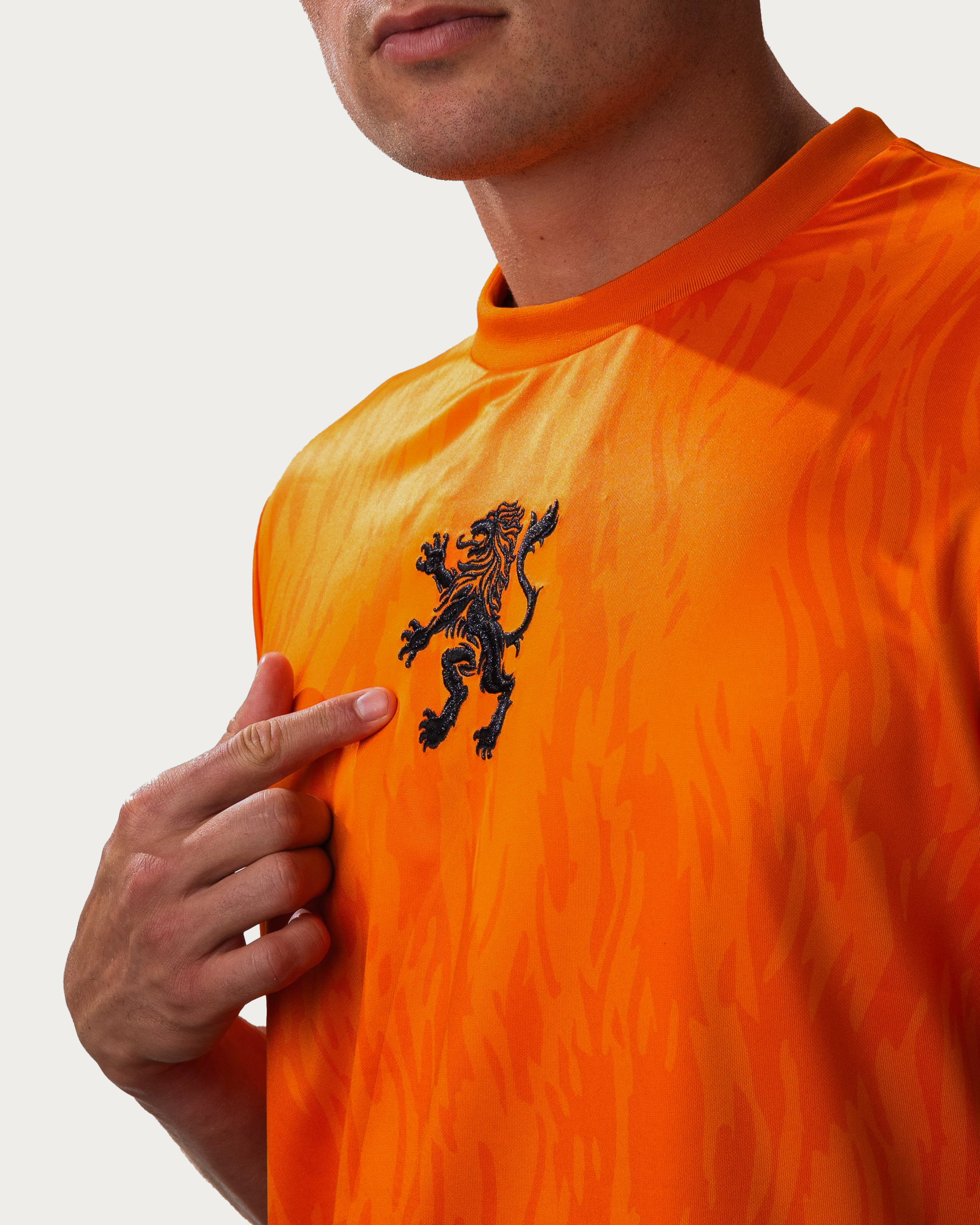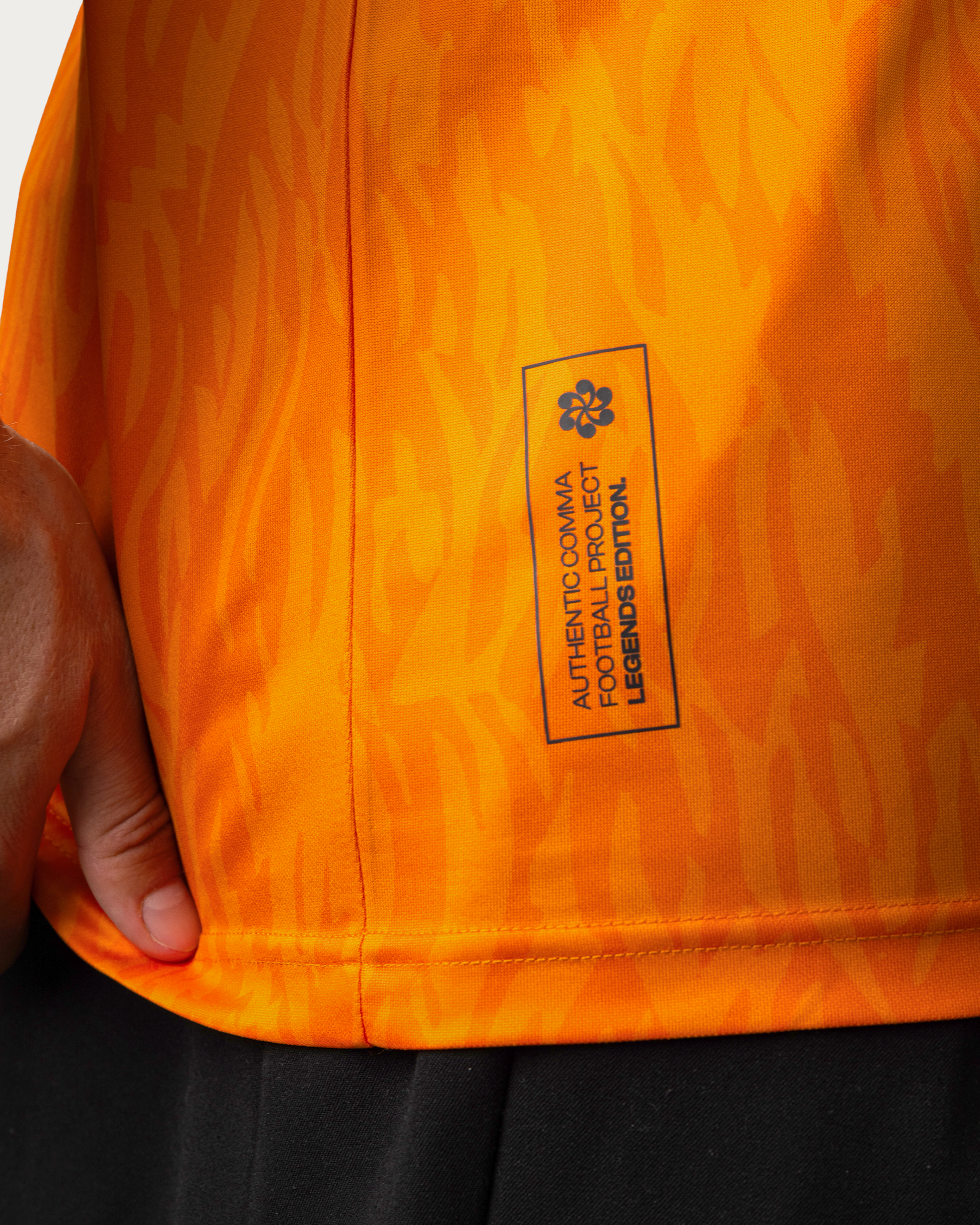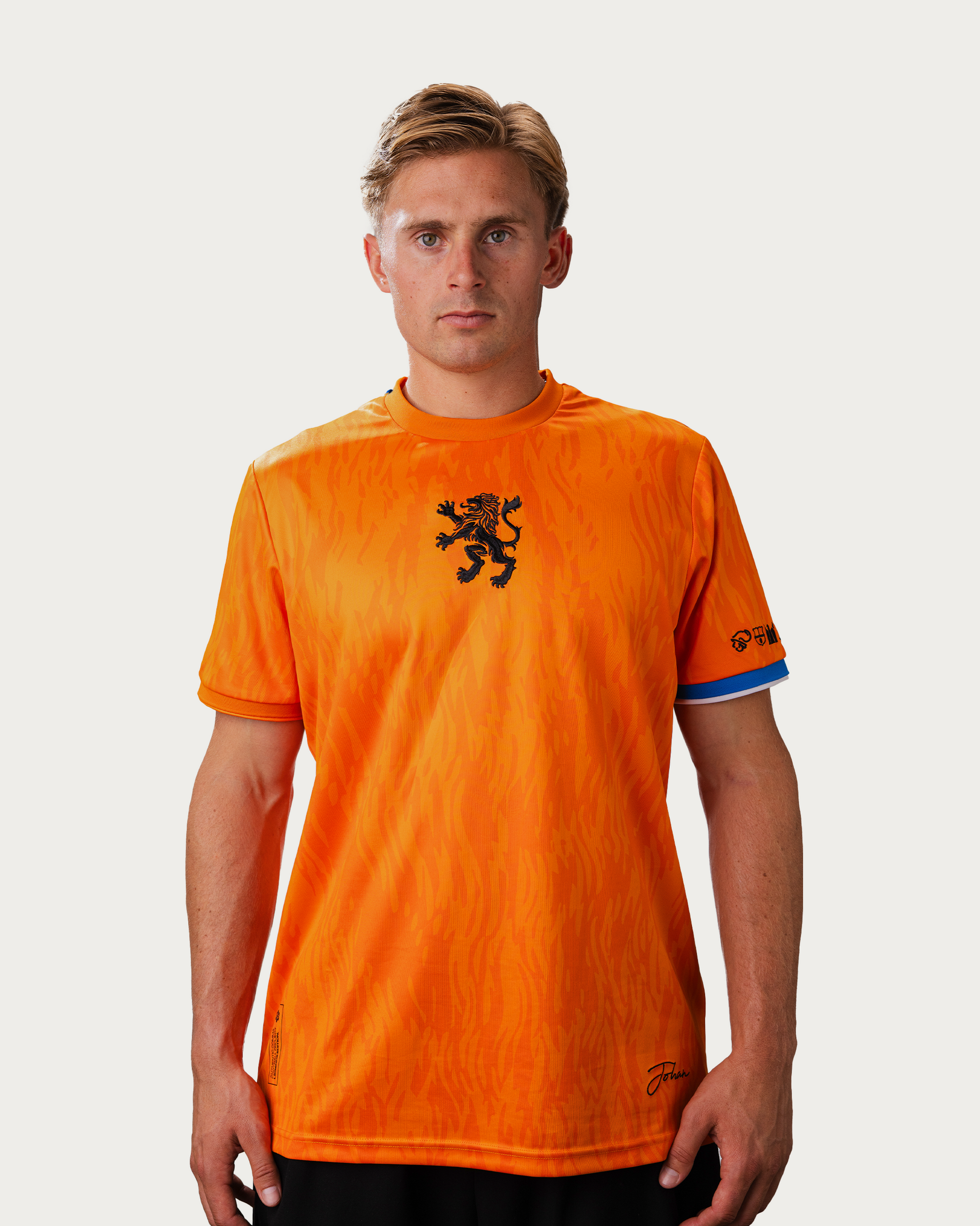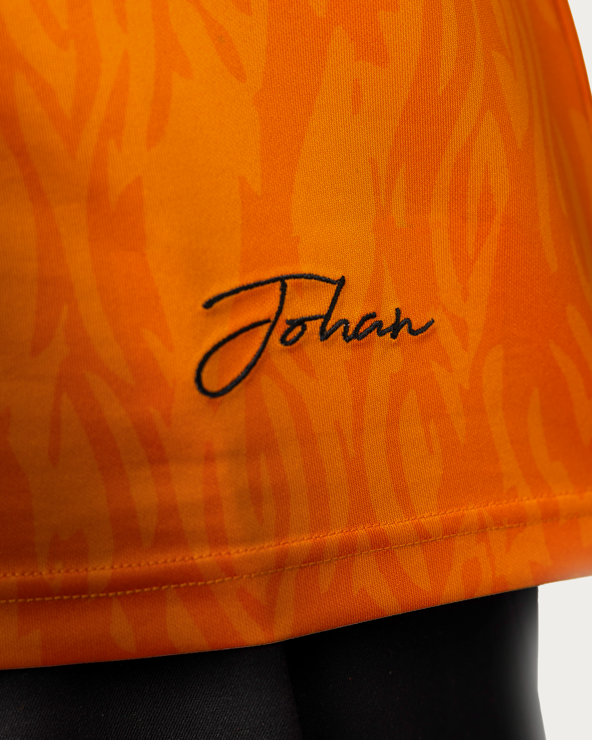 Featuring the crest of Netherlands, his club history from Amsterdam to Rotterdam, a captain's armband, a silhouette of his iconic celebration, and a pattern inspired by the Dutch Lion. A jersey that captures the entire career of Johan.