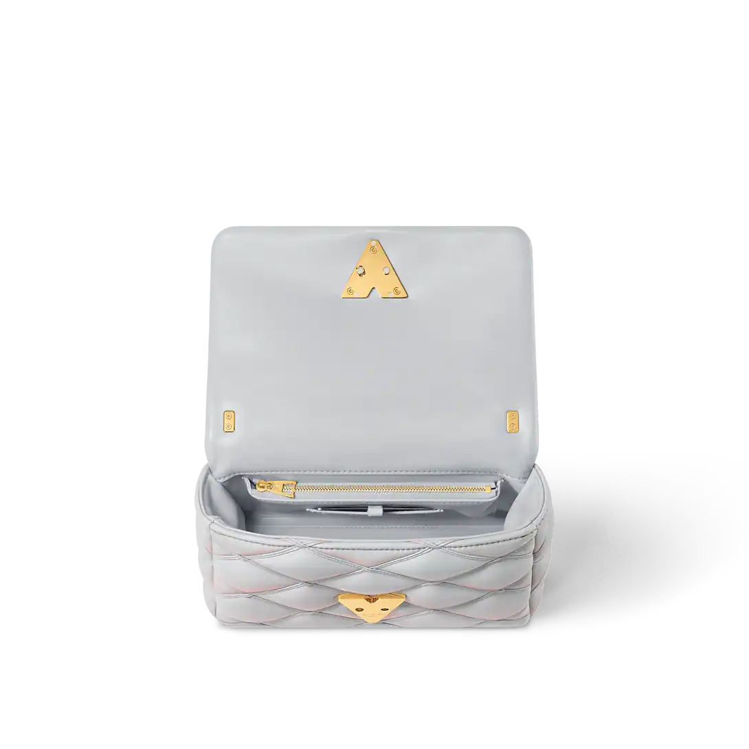 Creative Director Nicolas Ghesquière drew inspiration from Barcelona’s Park Guell stunning colors to create this statement edition of the Go-14 MM handbag – the park was the show venue for the House’s Cruise 2025 collection. Made from lambskin, it is sprayed with bi-color pigments to create iconic Malletage quilting adorned with gold-toned hardware. The interior is fitted with two pockets, plus a mirror for cosmetic touch-ups.
