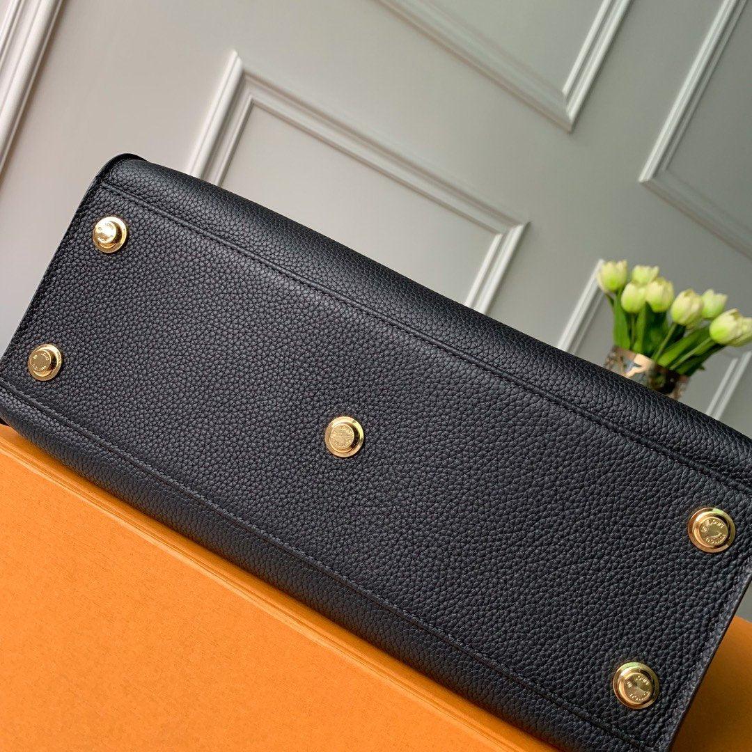 The On My Side MM tote bag is fashioned from an elegant combination of small-grained calf leather and emblematic Monogram canvas. The large outside pockets in contrasting canvas create a bag-in-a-bag look. The roomy interior can easily hold everything needed for a day at the office while the adjustable strap makes for practical cross-body carry.