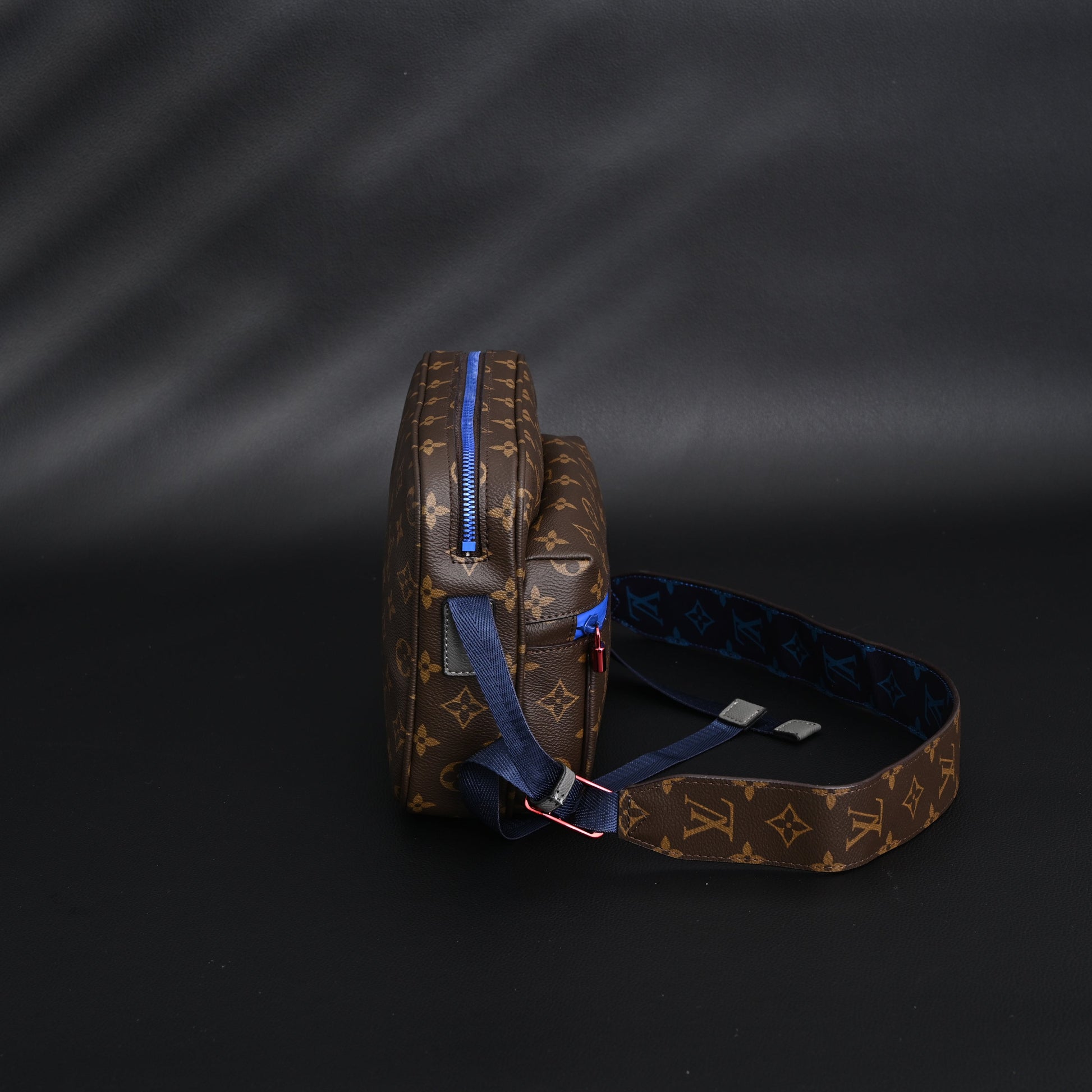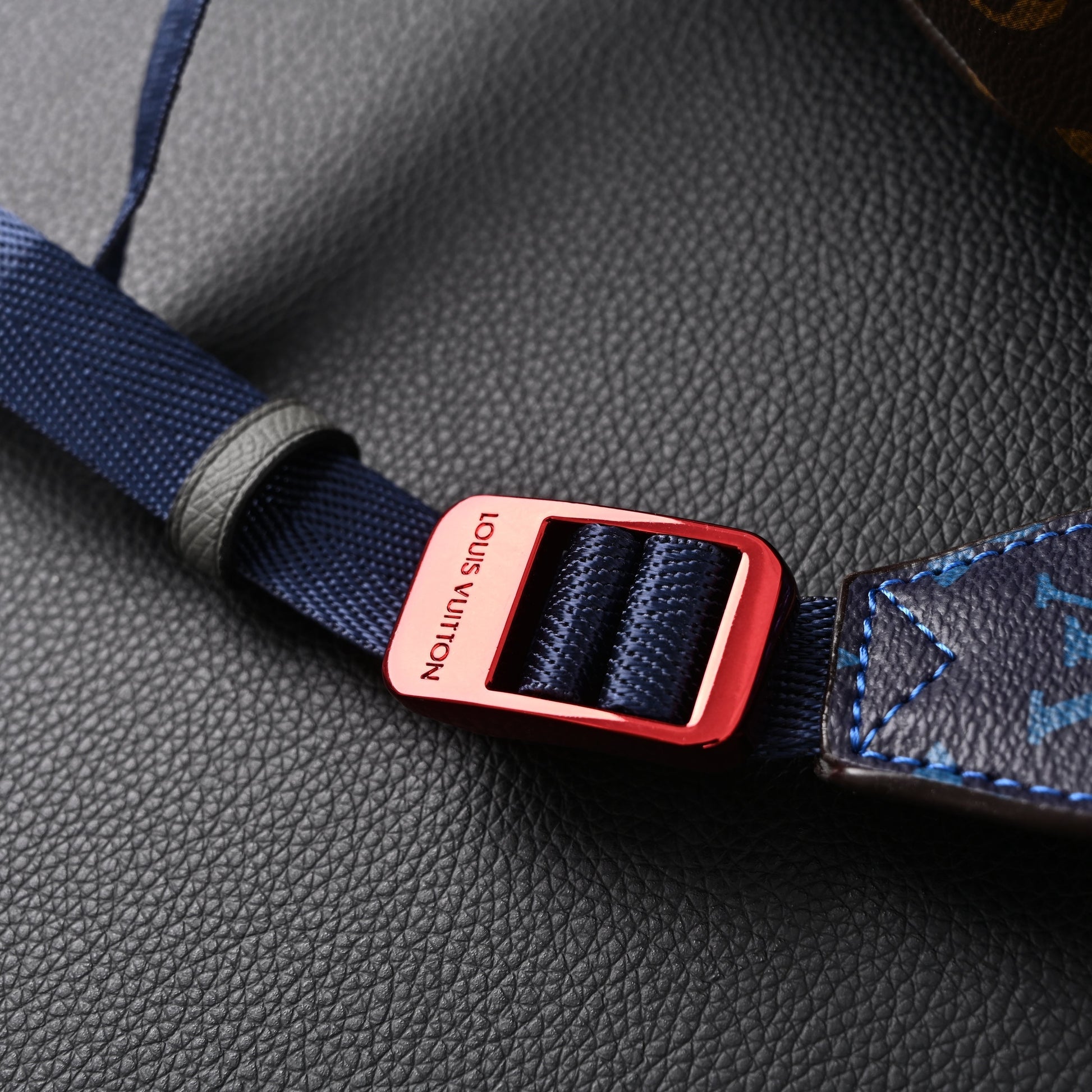 The standout feature is its adjustable jacquard strap in striking blue with “Louis Vuitton” signature, adding a bold contemporary touch. The bag includes three detachable components: a spacious main pouch, a smaller zippered pouch, and a removable coin purse, allowing for multiple ways to wear and style.