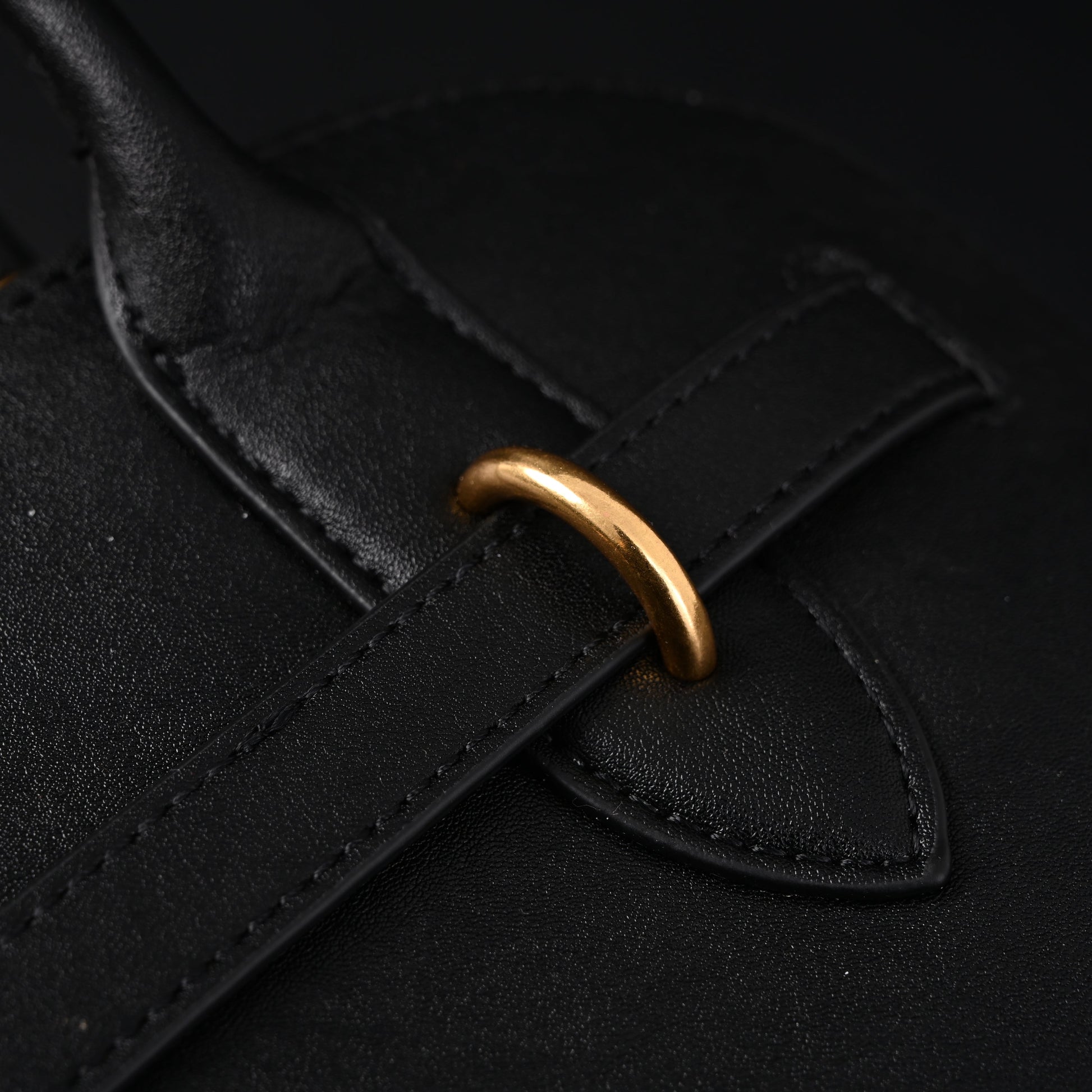 Features: Structured shape, spacious interior, detachable strap, dual top handles, protective bottom studs, elegant logo details