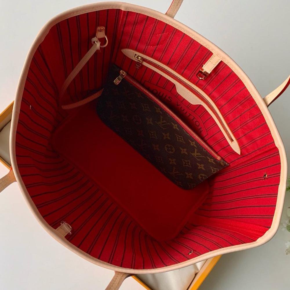 The Neverfull MM tote unites timeless design with heritage details. Made from supple Monogram canvas with natural cowhide trim, it is roomy yet not bulky, with side laces that cinch for a sleek allure or loosen for a casual look. Slim, comfortable handles slip easily over the shoulder or arm. Lined in colorful textile, it features a removable pouch which can be used as a clutch or an extra pocket.