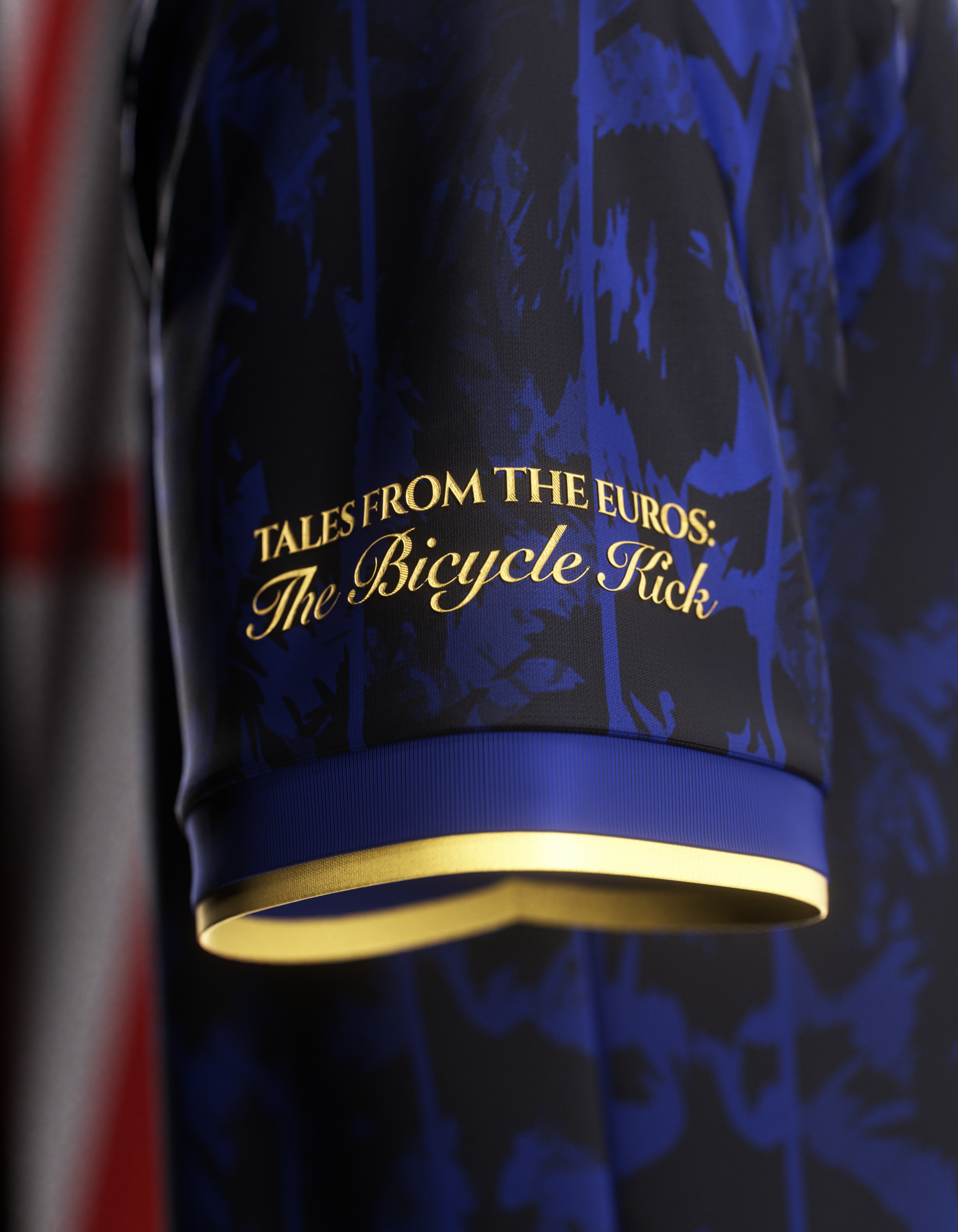 A deep blue, retro jersey featuring a lion-inspired pattern, gold detailing throughout, and a silhouette of the goal that changed everything.