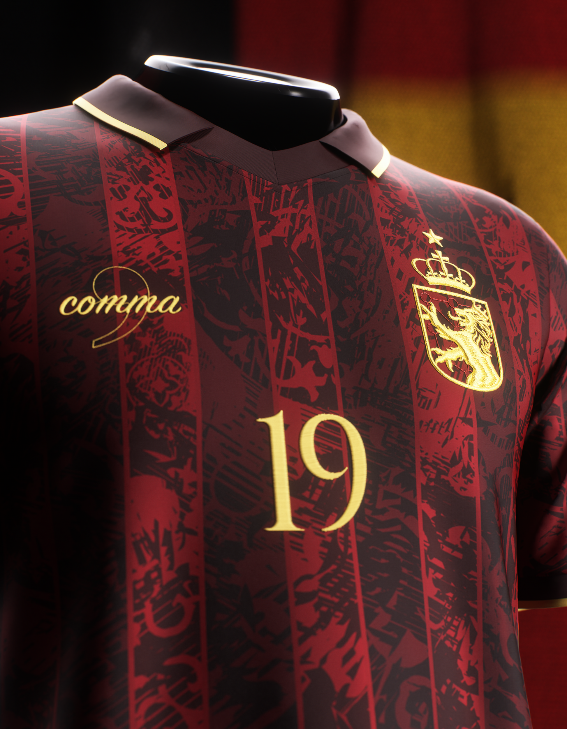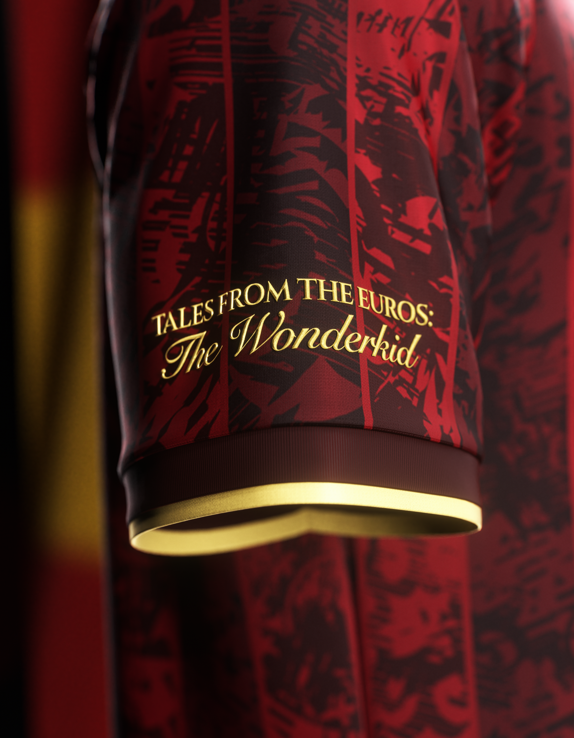 A deep red, retro jersey featuring a bull-inspired pattern, a silhouette of the goal that changed everything, and gold detailing throughout.